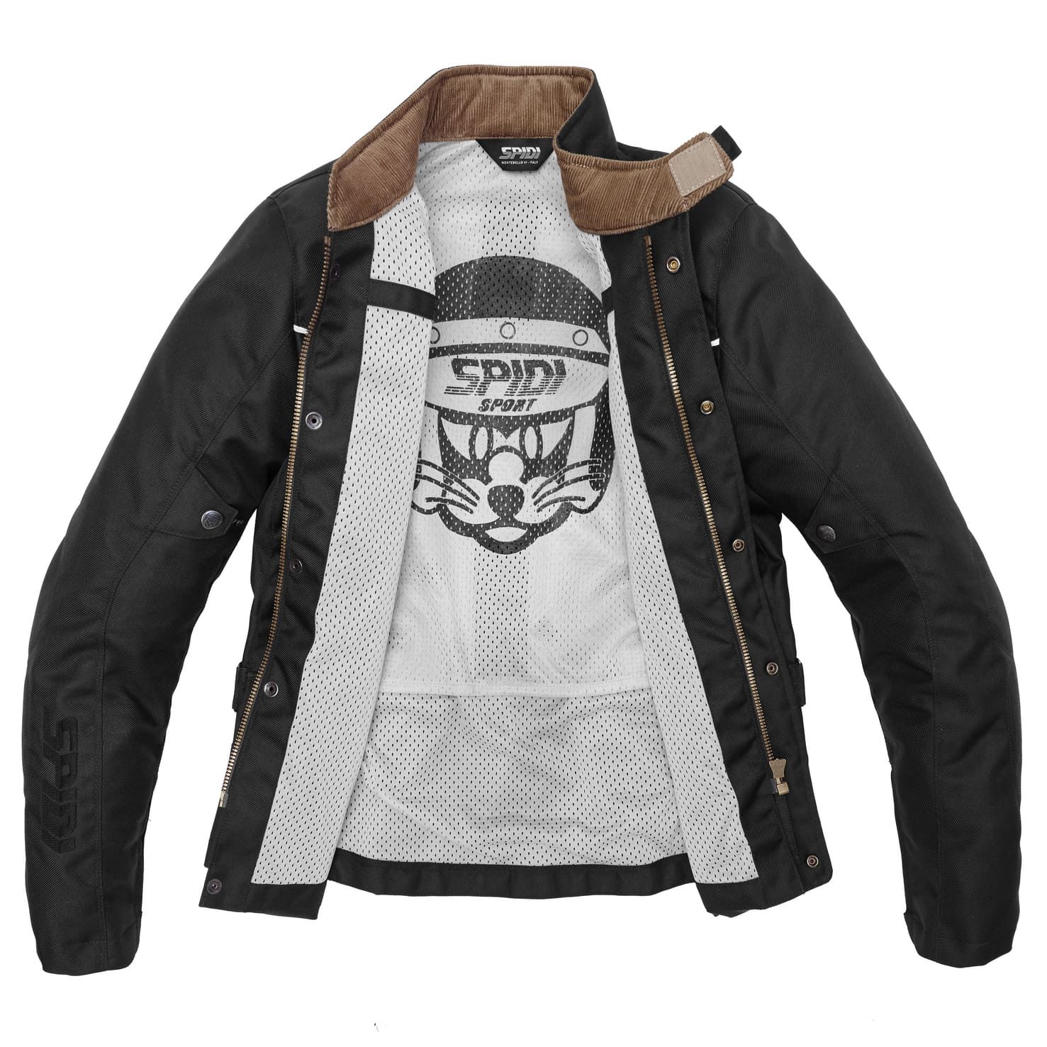 Mặt lưng dưới có trang bị lớp thun được may sẵn vào áo giúp áo luôn ôm sát cơ thể, bỏ đi những chi tiết đai cài hoặc dán, giúp tăng thêm sự tinh tế trong thiết kế của những mẫu áo cổ điển. Logo Spidi trên ngực có thể tháo rời, bạn có thể thiết kế những logo khác dán lên, tăng thêm phong cách cho chiếc áo của bạn.